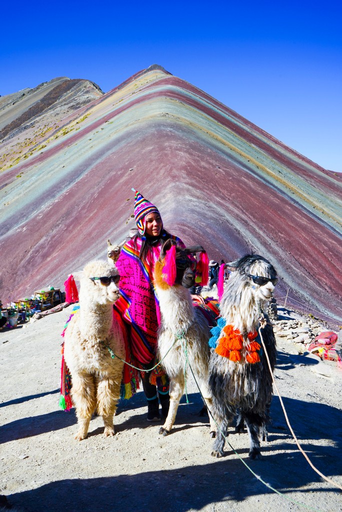 Vinicunca, also called Montaña de Siete Colores (Mountain of Seven Colors), is located in the Andes in the Cusco region of Peru. In order to get to the trailhead, it’s a three-hour drive from Cusco. To get to the lookout, you’ll need to hike about six miles. The trip is fairly challenging so it’s not recommended for beginner hikers. I am so grateful that we have professional guides who carry medicine and oxygen to help with the altitude sickness, and they are very attentive to every person on the tour.